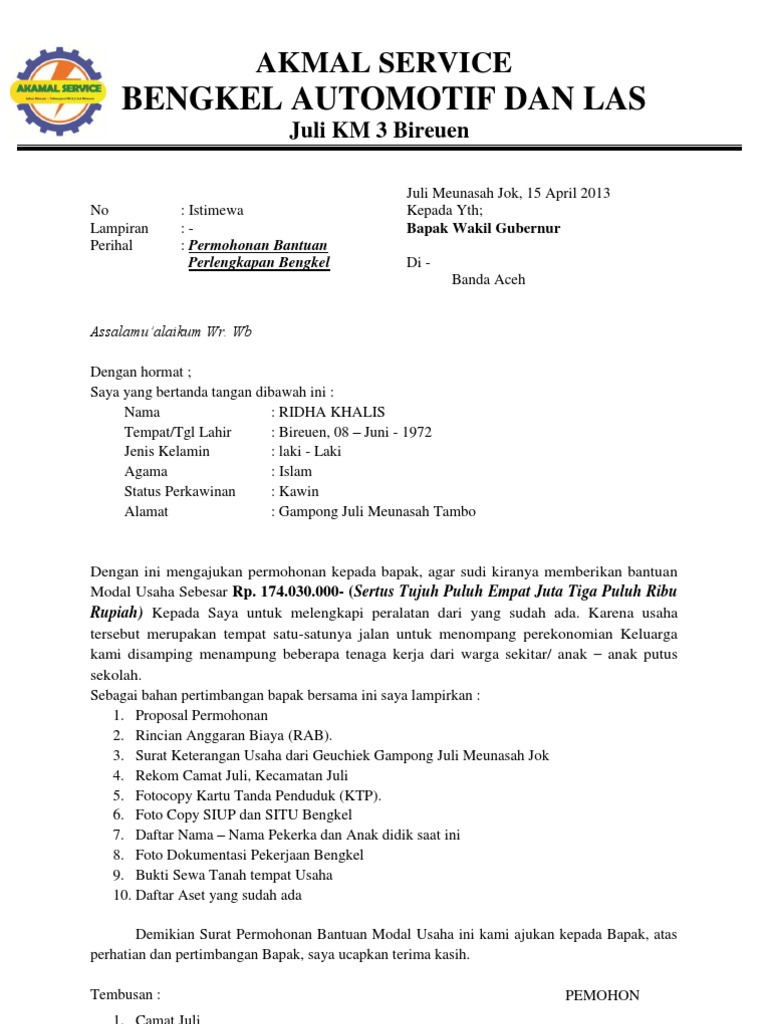Contoh Proposal Permohonan Bantuan Alat Bengkel - Berbagi Contoh Proposal