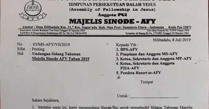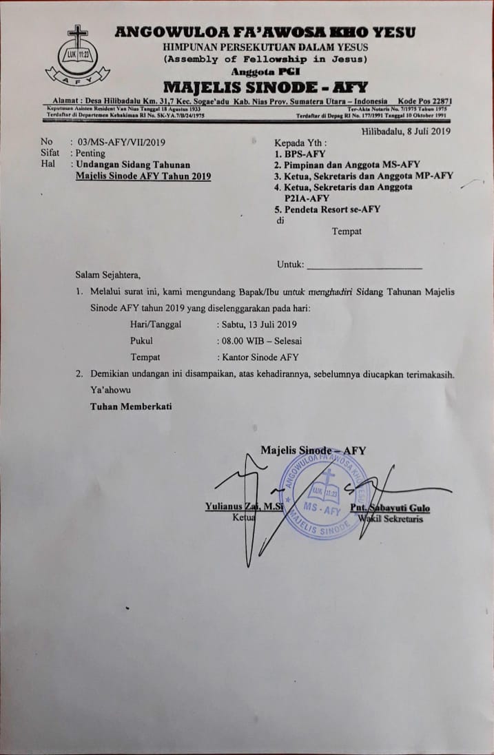 Undangan Sidang Tahunan Majelis Sinode AFY Tahun 2019 - Gereja AFY