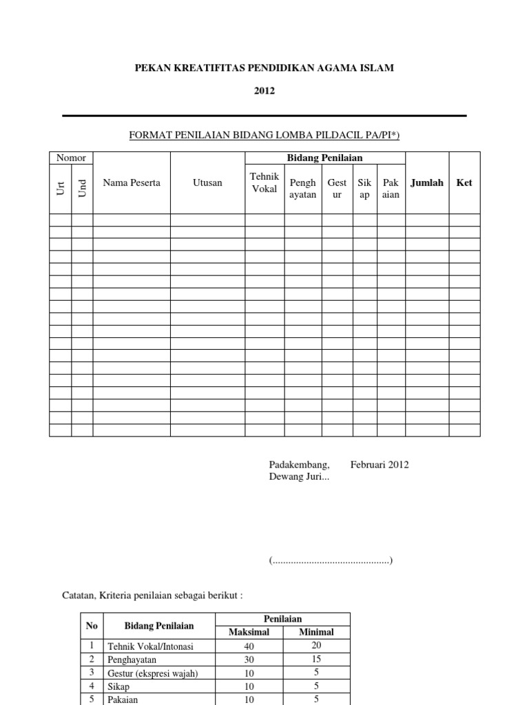 DOC) FORMAT PENILAIAN LOMBA PILDACIL ANTAR SD | Dhewy Forthuna Tolang - Academia.edu