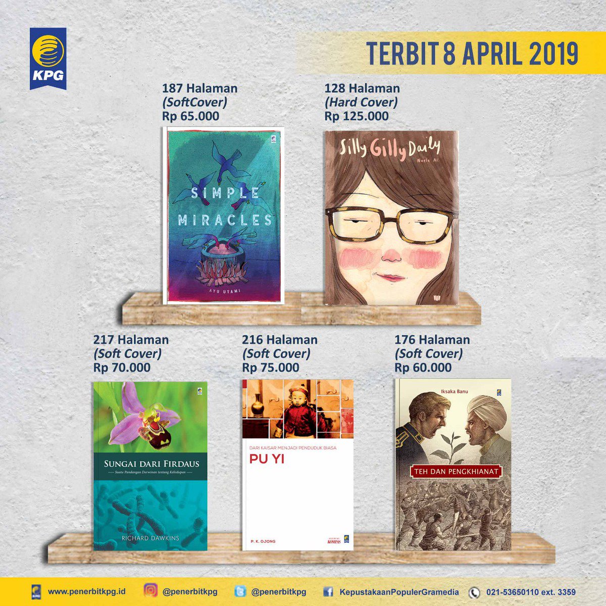 Penerbit KPG Twitter : “Hari yang dinanti telah tiba. Buku-buku terbaru KPG dari sastra, pop, sejarah, biografi, kumpulan cerpen, sains, semua bisa kamu miliki. Dapatkan segera di @gramedia atau @gramediadotcom. #SimpleMiracles #SillyGillyDaily #