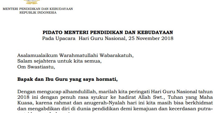 Pidato Mendikbud pada Upacara Hari Guru Nasional 2019 (resmi) | Informasi Pendidikan dan Dunia Kerja