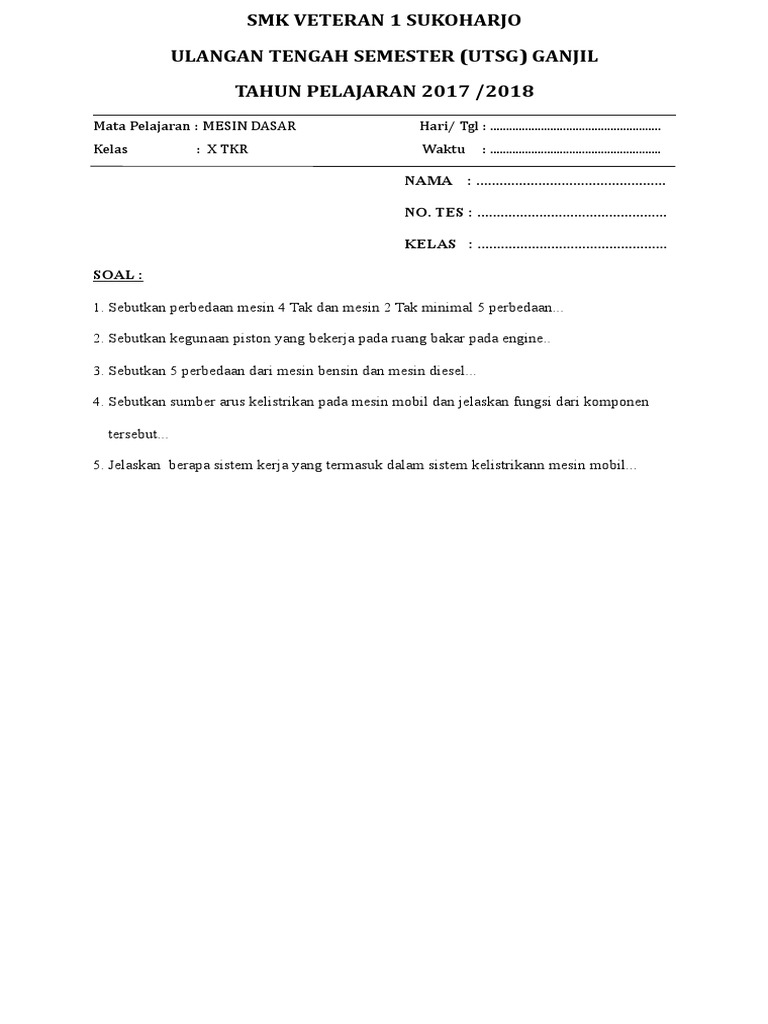 Contoh Soal dan Jawaban Perawatan Mesin Kendaraan 1 | teknik …