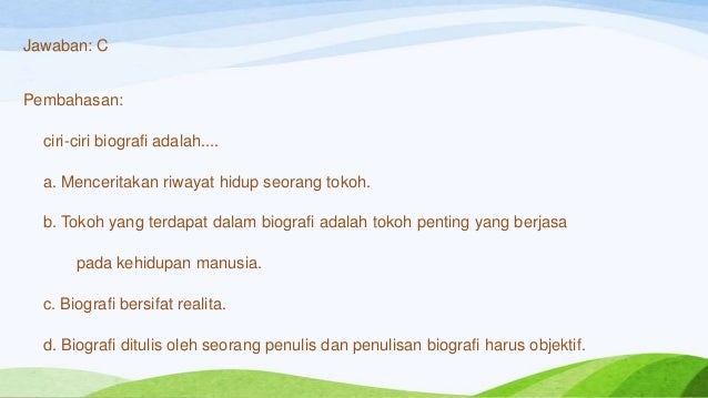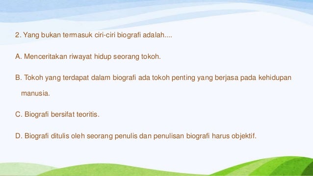 Berikut ini yang bukan ciri-ciri biografi adalah … A. Menceritakan riwayat hidup seorang - Brainly.co.id